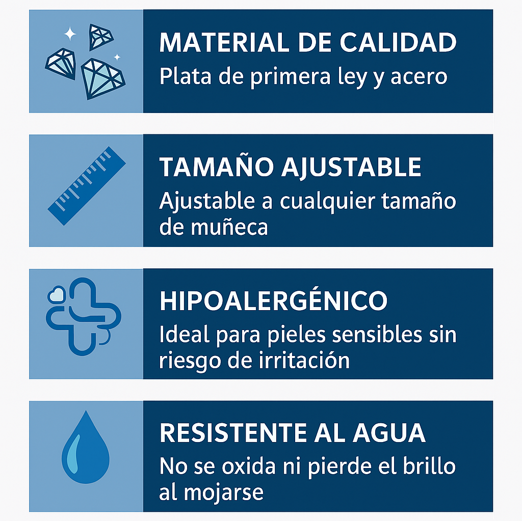 Está fabricada en plata de ley 925 con un acabado pulido y resistente al agua. Cada pieza se revisa individualmente para garantizar su durabilidad y brillo natural.